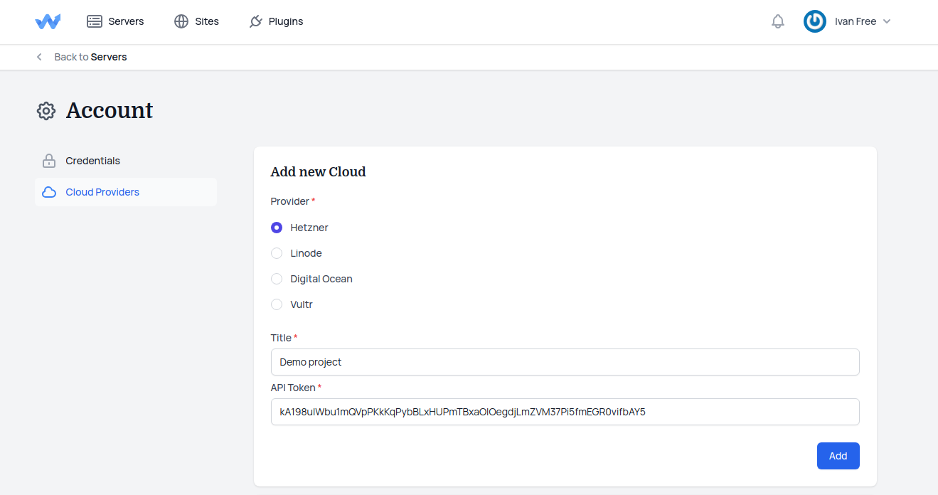 Fill out the Add new Cloud form, choose Hetzner, and input the title and the API token.