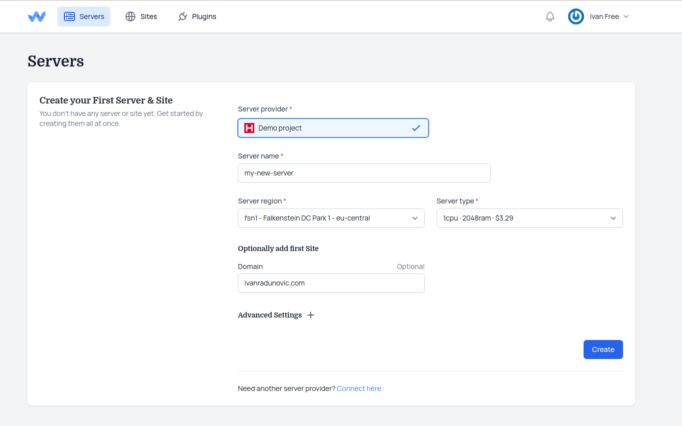 After connecting Hetzner, you’ll automatically be redirected to the Create Server form.