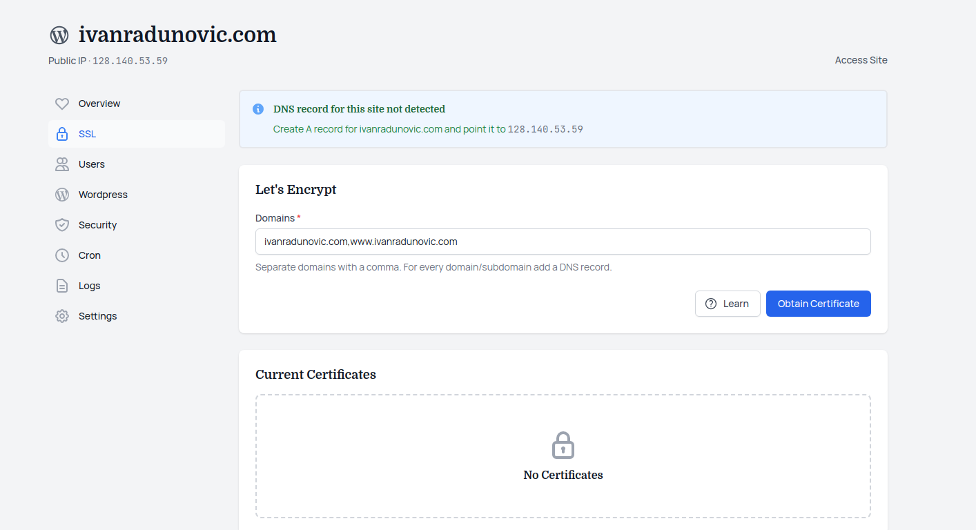 If the certificate is stuck on Obtaining after a few minutes, that usually means your DNS records are not configured, or they didn’t propagate.