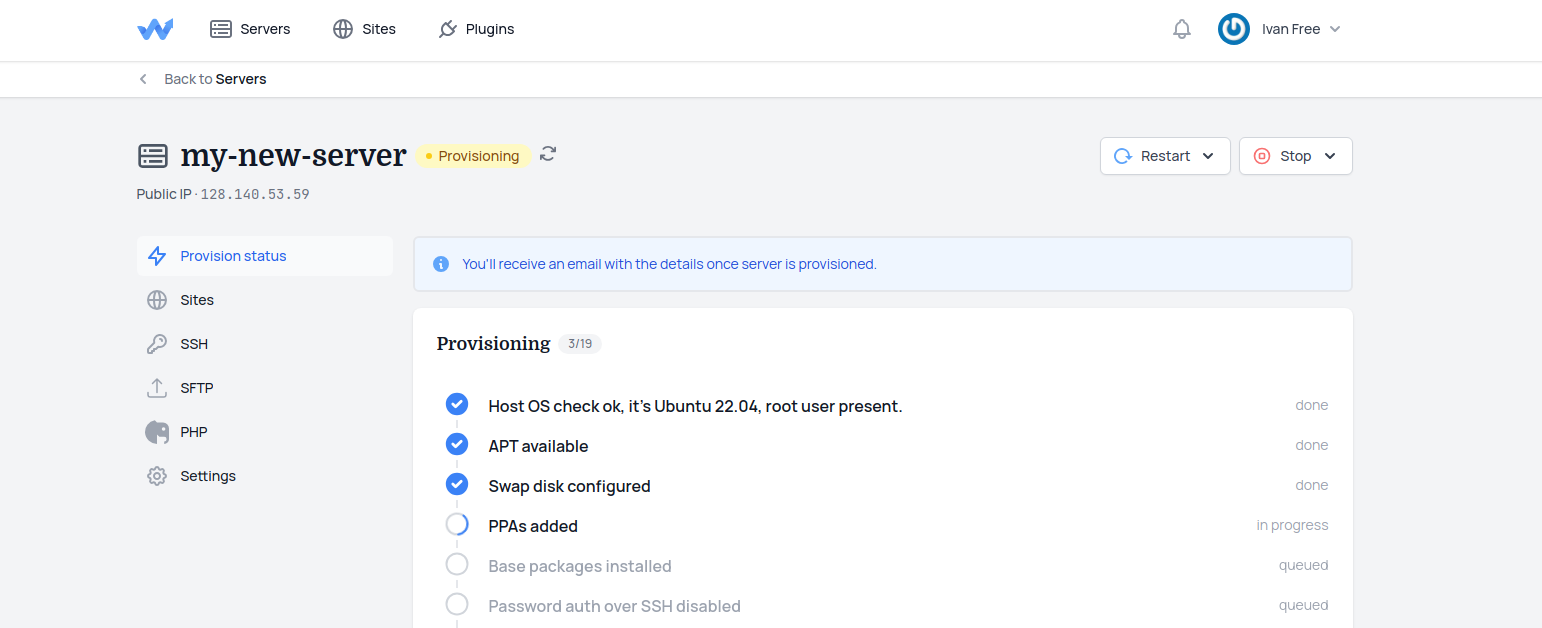 When you click the Create button, WPJack will contact Hetzner via API and start a new instance for you. Provision of the new server takes up to 10 minutes, depending on the Hetzner side. The good thing is this happens only once. After that, adding new sites into it takes only a few seconds.